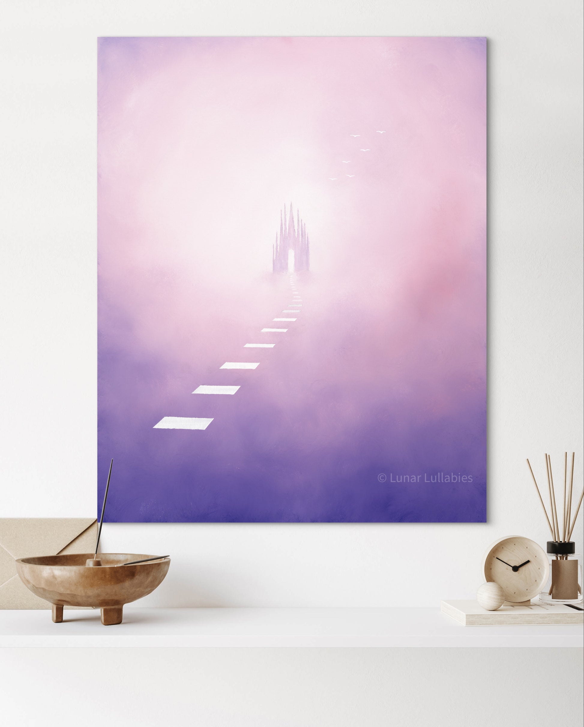 Description:Acrylic Painting of a pastel pink and purple clouds and a path leading to a castle in the clouds.